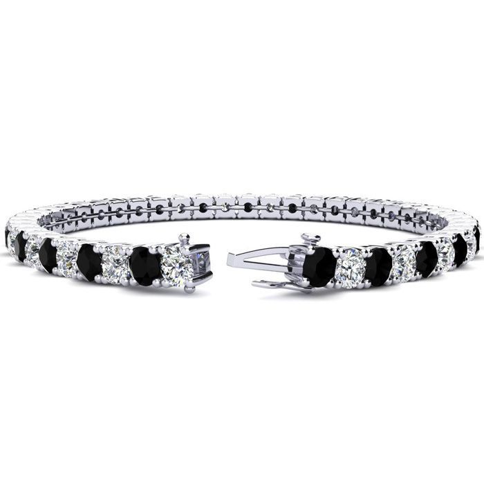 This classic gemstone bracelet features shimmering white diamonds in I-J color, I1-I2 clarity and black diamonds in I3 clarity. The 6 inch bracelet contains 39 black and white diamonds at 7.80 carats. The 6.5 inch bracelet contains 42 black and white diamonds at 8.60 carats. The 7 inch bracelet contains 45 black and white diamonds at 9.20 carats. The 7.5 inch bracelet contains 49 black and white diamonds at 9.80 carats. The 8 inch bracelet contains 53 black and white diamonds at 10.60 carats. The 8.5 inch bracelet contains 56 black and white diamonds at 11.20 carats. The 9 inch bracelet contains 59 black and white diamonds at 11.80 carats. This bracelet is approximately 3.8mm wide and is crafted in 14 karat white gold. This bracelet has a secure, box with tongue and safety clasp.