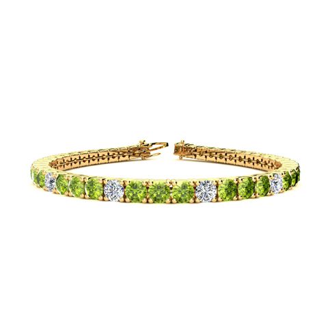 This classic gemstone bracelet features shimmering white diamonds in I-J color, I1-I2 clarity and peridot gemstones. The 6 inch bracelet contains 39 gemstones and diamonds at 7.80 carats. The 6.5 inch bracelet contains 42 gemstones and diamonds at 8.60 carats. The 7 inch bracelet contains 45 gemstones and diamonds at 9.20 carats. The 7.5 inch bracelet contains 49 gemstones and diamonds at 9.80 carats. The 8 inch bracelet contains 53 gemstones and diamonds at 10.60 carats. The 8.5 inch bracelet contains 56 gemstones and diamonds at 11.20 carats. The 9 inch bracelet contains 59 gemstones and diamonds at 11.80 carats. This bracelet is approximately 3.8mm wide and is crafted in 14 karat yellow gold. This bracelet has a secure, box with tongue and safety clasp.