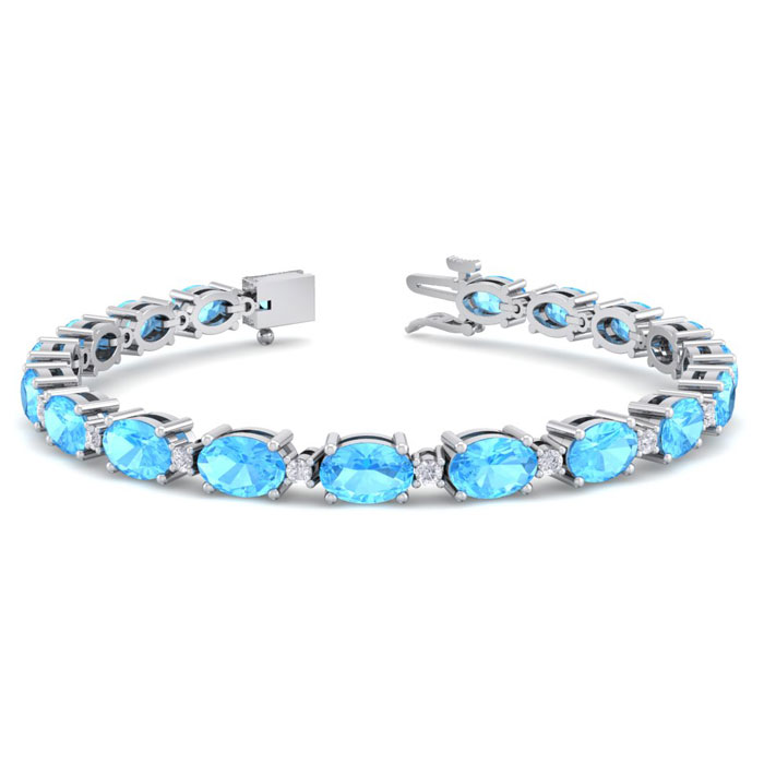 11 Carat Oval Shape Blue Topaz and Diamond Bracelet In 14 Karat White Gold, 7 Inches