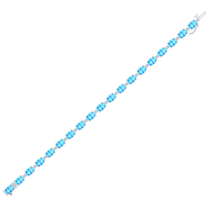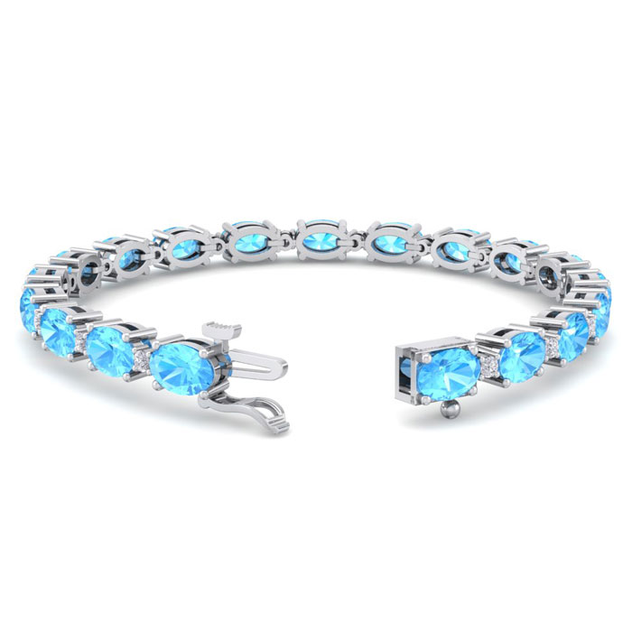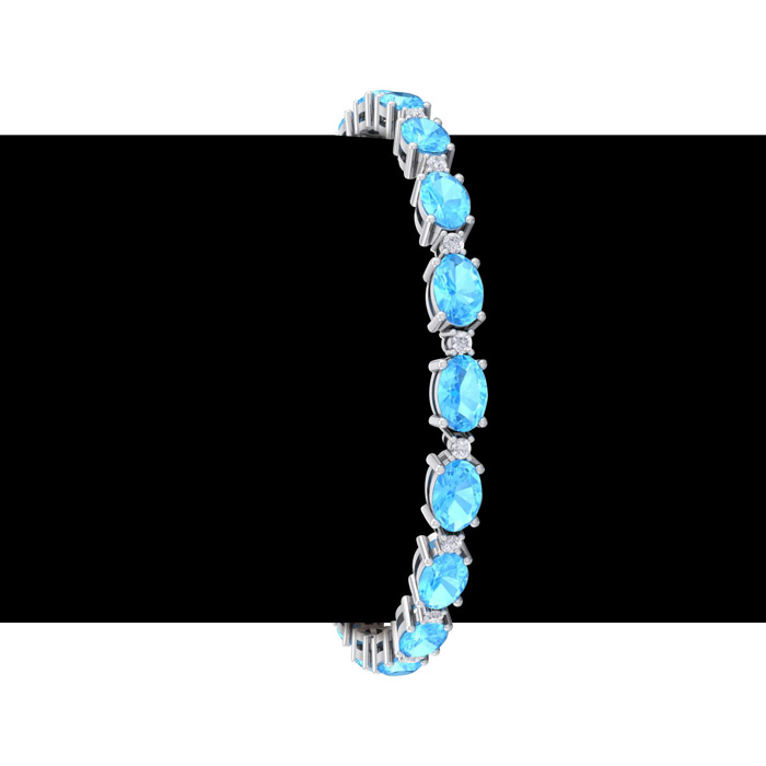 This gemstone bracelet features 19 oval shape 6x4mm blue topaz gemstones totaling approximately 10 1/2 carats. There are 19 round shape diamonds in I-J color, I2 clarity totaling approximately 0.40 carats. Total carat weight is 11 carats. This gemstone bracelet is in 14 karat white gold and is 7 inches long. It comes with a secure box with tongue and safety clasp.