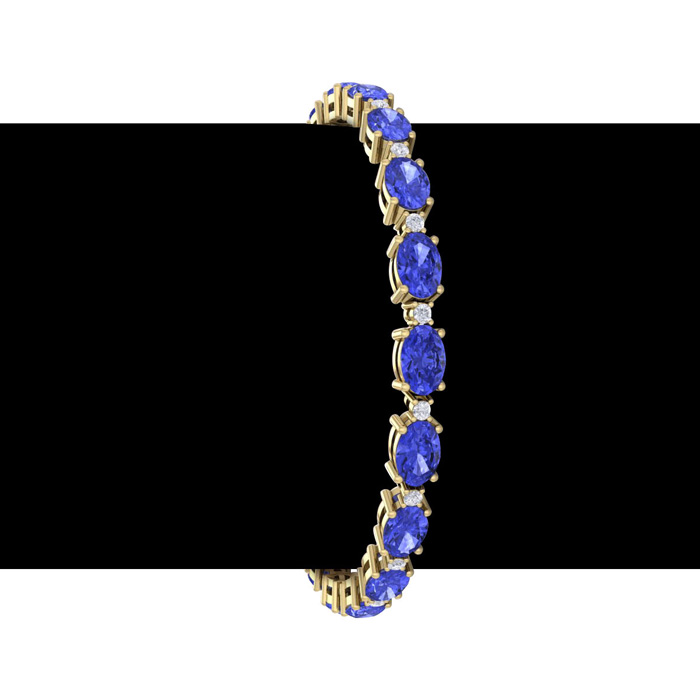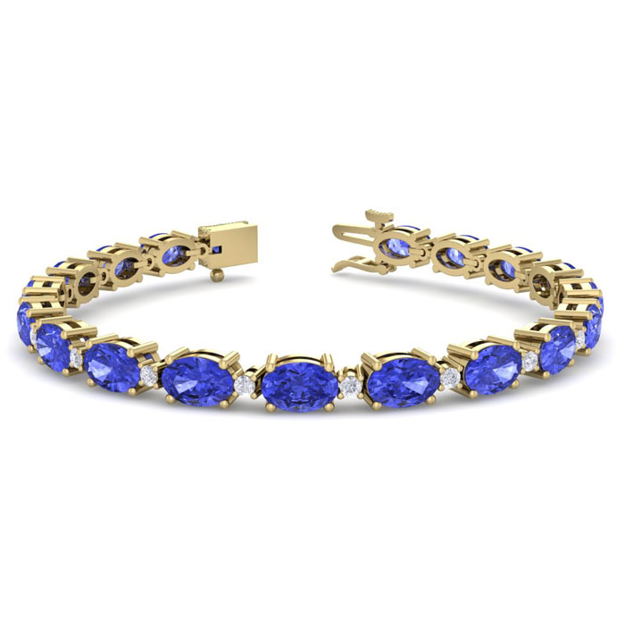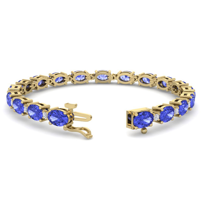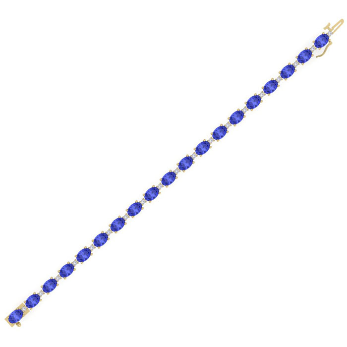 This gemstone bracelet features 19 oval shape 6x4mm tanzanite gemstones totaling approximately 10 1/2 carats. There are 19 round shape diamonds in I-J color, I2 clarity totaling approximately 0.40 carats. Total carat weight is 11 carats. This gemstone bracelet is in 14 karat yellow gold and is 7 inches long. It comes with a secure box with tongue and safety clasp.