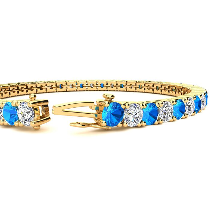 This classic gemstone bracelet features shimmering white diamonds in I-J color, I1-I2 clarity and blue topaz gemstones. The 6 inch bracelet contains 39 gemstones and diamonds at 8.75 carats. The 6.5 inch bracelet contains 42 gemstones and diamonds at 9.65 carats. The 7 inch bracelet contains 45 gemstones and diamonds at 10.35 carats. The 7.5 inch bracelet contains 49 gemstones and diamonds at 11 carats. The 8 inch bracelet contains 53 gemstones and diamonds at 11.90 carats. The 8.5 inch bracelet contains 56 gemstones and diamonds at 12.60 carats. The 9 inch bracelet contains 59 gemstones and diamonds at 13.25 carats. This bracelet is approximately 3.8mm wide and is crafted in 14 karat yellow gold. This bracelet has a secure, box with tongue and safety clasp.