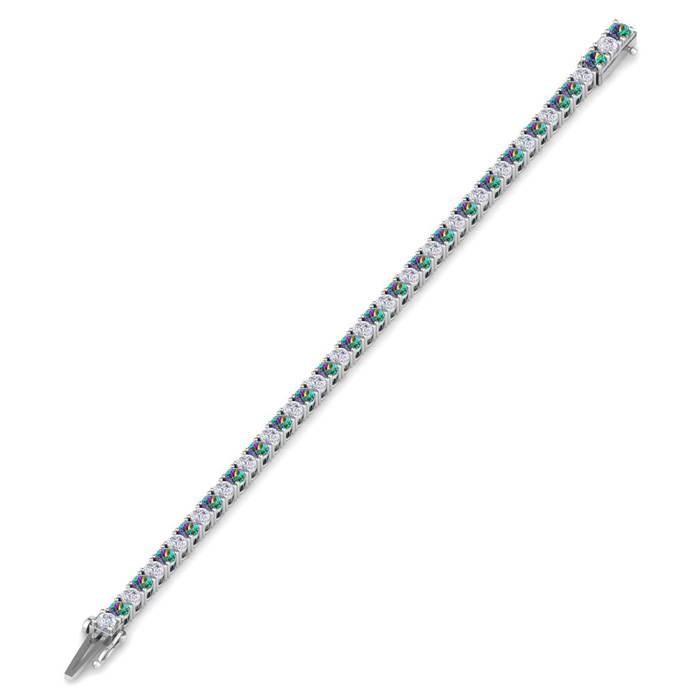 This classic gemstone bracelet features shimmering white diamonds in I-J color, I1-I2 clarity and mystic topaz gemstones. The 6 inch bracelet contains 39 gemstones and diamonds at 8.75 carats. The 6.5 inch bracelet contains 42 gemstones and diamonds at 9.65 carats. The 7 inch bracelet contains 45 gemstones and diamonds at 10.35 carats. The 7.5 inch bracelet contains 49 gemstones and diamonds at 11 carats. The 8 inch bracelet contains 53 gemstones and diamonds at 11.90 carats. The 8.5 inch bracelet contains 56 gemstones and diamonds at 12.60 carats. The 9 inch bracelet contains 59 gemstones and diamonds at 13.25 carats. This bracelet is approximately 3.8mm wide and is crafted in 14 karat white gold. This bracelet has a secure, box with tongue and safety clasp.