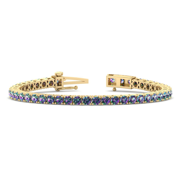 This classic gemstone bracelet features shimmering mystic topaz gemstones. The 6 inch bracelet contains 39 gemstones at 9.75 carats. The 6.5 inch bracelet contains 42 gemstones at 10.75 carats. The 7 inch bracelet contains 45 gemstones at 11.50 carats. The 7.5 inch bracelet contains 49 gemstones at 12.25 carats. The 8 inch bracelet contains 53 gemstones at 13.25 carats. The 8.5 inch bracelet contains 56 gemstones at 14 carats. The 9 inch bracelet contains 59 gemstones at 14.75 carats. This bracelet is approximately 3.8mm wide and is crafted in 14 karat yellow gold. This bracelet has a secure, box with tongue and safety clasp.