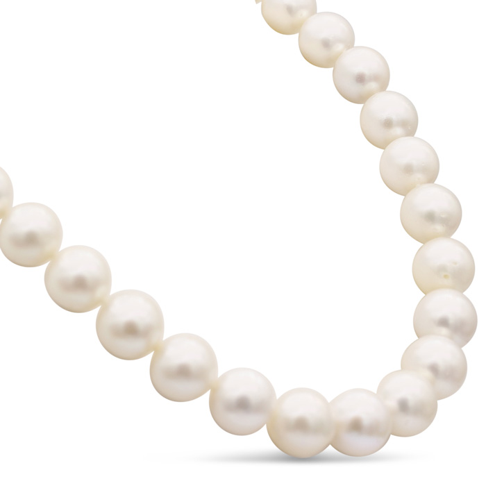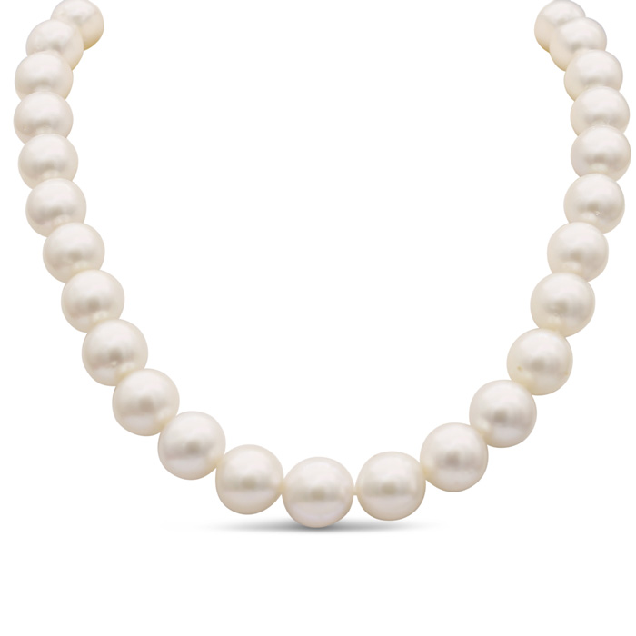 This stunning pearl strand necklace features 33 white Tahitian pearls measuring 12-14mm in AAA quality. This necklace has a 14 karat white gold ball clasp. The clasp has 2 sparkling diamond accents in J-K color, I1-I2 clarity at 0.06 carats.