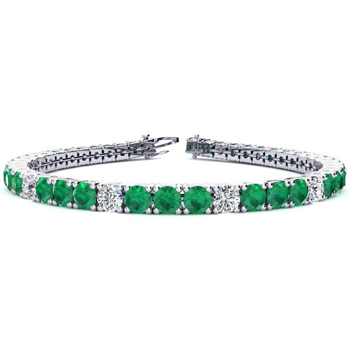 This classic gemstone bracelet features shimmering white diamonds in I-J color, I1-I2 clarity and emerald gemstones. The 6 inch bracelet contains 39 gemstones and diamonds at 9.30 carats. The 6.5 inch bracelet contains 42 gemstones and diamonds at 10.25 carats. The 7 inch bracelet contains 45 gemstones and diamonds at 10.95 carats. The 7.5 inch bracelet contains 49 gemstones and diamonds at 11.65 carats. The 8 inch bracelet contains 53 gemstones and diamonds at 12.60 carats. The 8.5 inch bracelet contains 56 gemstones and diamonds at 13.30 carats. The 9 inch bracelet contains 59 gemstones and diamonds at 14.05 carats. This bracelet is approximately 3.8mm wide and is crafted in 14 karat white gold. This bracelet has a secure, box with tongue and safety clasp.