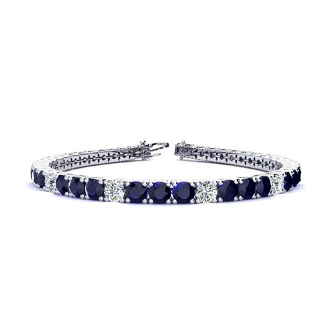 This classic gemstone bracelet features shimmering white diamonds in I-J color, I1-I2 clarity and sapphire gemstones. The 6 inch bracelet contains 39 gemstones and diamonds at 10.20 carats. The 6.5 inch bracelet contains 42 gemstones and diamonds at 11.24 carats. The 7 inch bracelet contains 45 gemstones and diamonds at 12 carats. The 7.5 inch bracelet contains 49 gemstones and diamonds at 12.76 carats. The 8 inch bracelet contains 53 gemstones and diamonds at 13.80 carats. The 8.5 inch bracelet contains 56 gemstones and diamonds at 14.56 carats. The 9 inch bracelet contains 59 gemstones and diamonds at 15.40 carats. This bracelet is approximately 3.8mm wide and is crafted in 14 karat white gold. This bracelet has a secure, box with tongue and safety clasp.