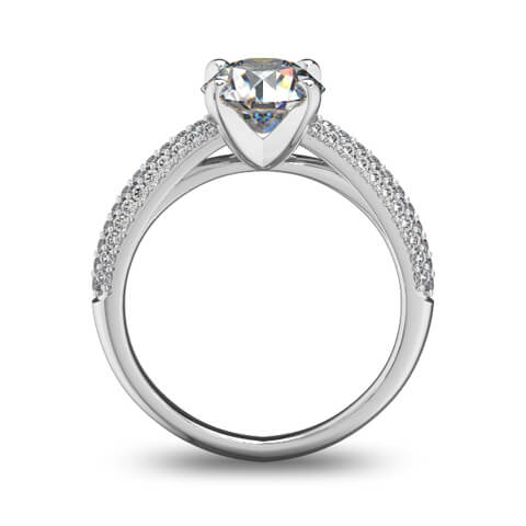This classic diamond engagement ring features 1 huge 1.75 carat clarity enhanced round center diamond. It I surrounded by 68 round diamonds in I-J color, I1-I2 clarity, totaling at 0.34 carats. The entire ring is 2.09 carats and is in 14 karat white gold.
