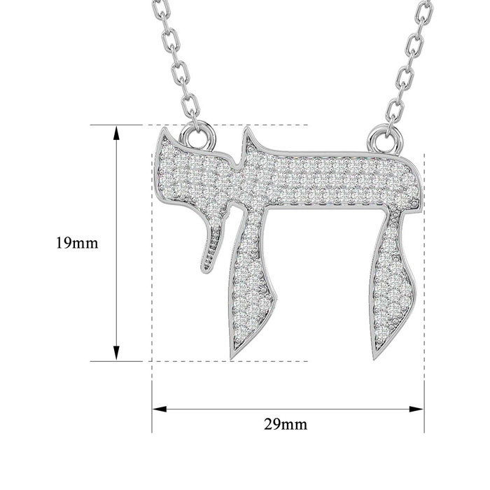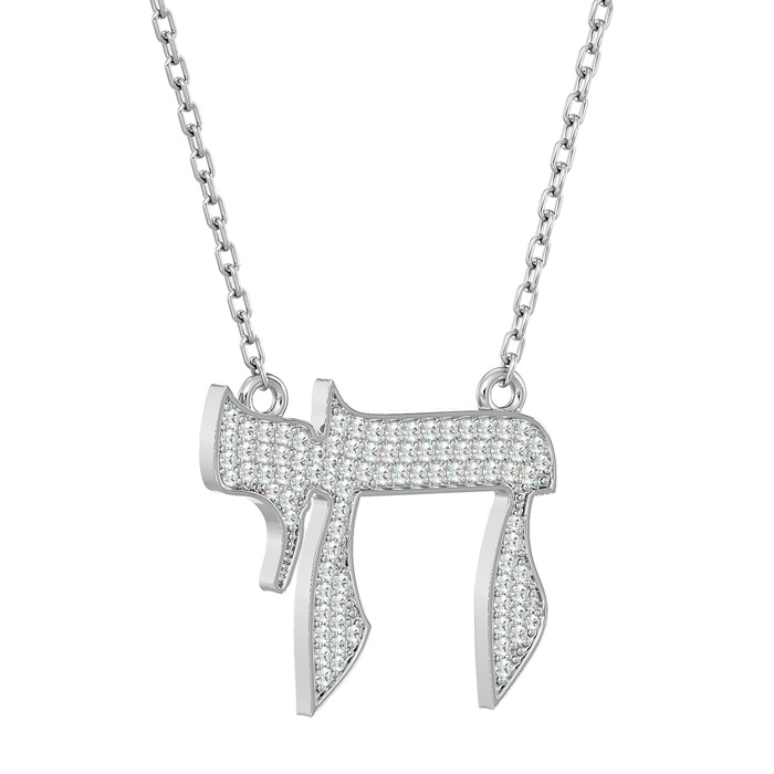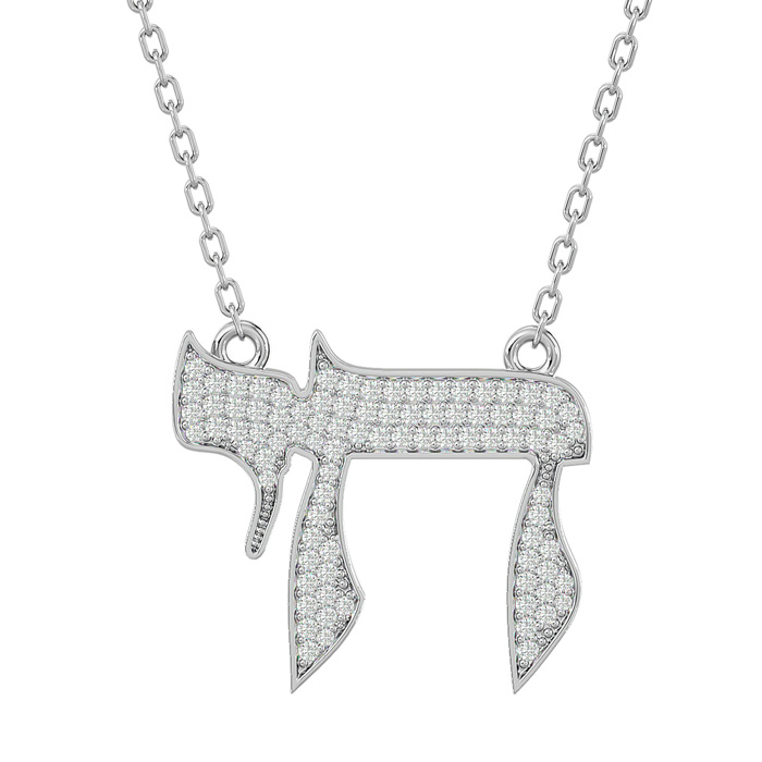 This classic Chai necklace features a Chai measuring 1 inch wide and 3/4 inch long. It is adorned with 75 sparkling diamonds in I-J color, I1-I2 clarity at 3/4 carats total. This pendant hangs on a 14 karat white gold 18 inch cable chain with a spring-ring clasp.