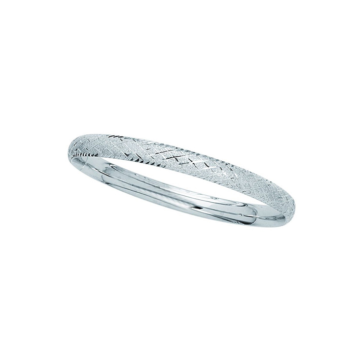 This shiny textured sparkle bangle with a diamond-shaped pattern is 7 inches long and 6.0mm wide. It has a secure, hidden-safety clasp and is in 14 karat white gold.