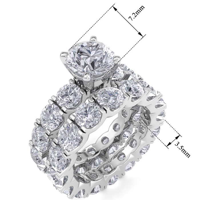 This classic eternity bridal set features 1 huge round brilliant center lab grown diamond at 1.50 carats. It is surrounded by 14 lab grown diamonds at 3.50 carats total. The matching band contains 16 lab grown diamonds at 4 carats. Total carat weight of the set is 9 carats. lab grown diamond color is G-H, lab grown diamond clarity is VS. Ring is crafted in 14 karat white gold and is 4mm wide.