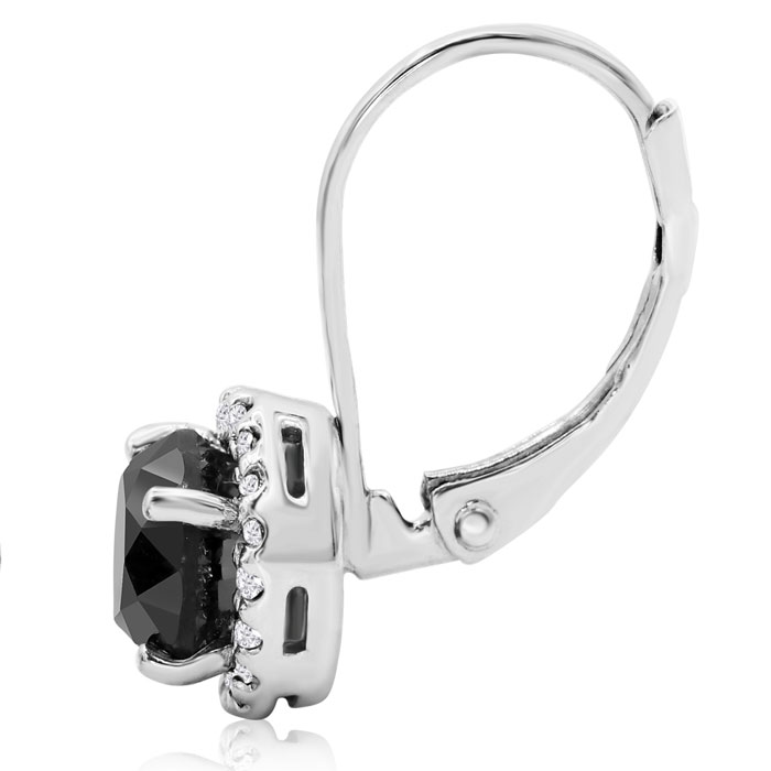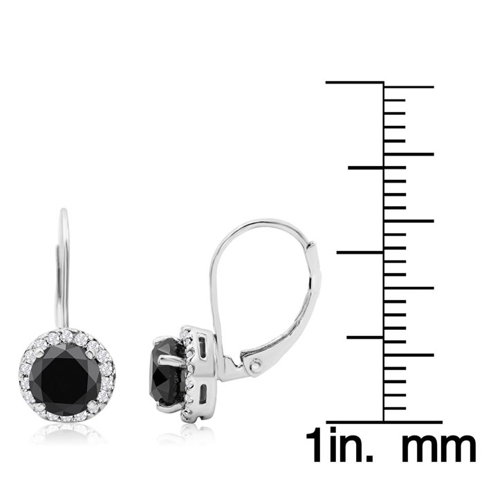 These striking earrings feature two round shape black diamonds at 2 carats total weight in I3 clarity. Each black diamond is surrounded by a halo of white diamonds in G-H color, I1-I2 clarity. Total white diamond weight is 0.18 carats. Total gem weight is 2.18 carats. These earrings are crafted in 14 karat white gold and have secure leverbacks. Earrings dangle down about 1/2 inch and are 7.5mm wide.