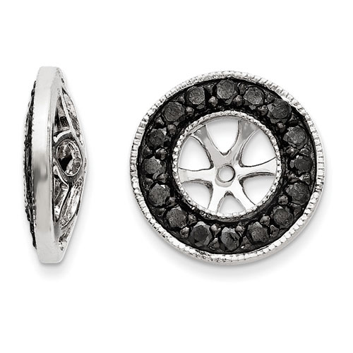 These stylish earring jackets are crafted in quality 14 karat white gold and feature 36 round beautiful black diamonds, at approximately .34 carat total weight. This set will dress up any black, or clear diamond studs.