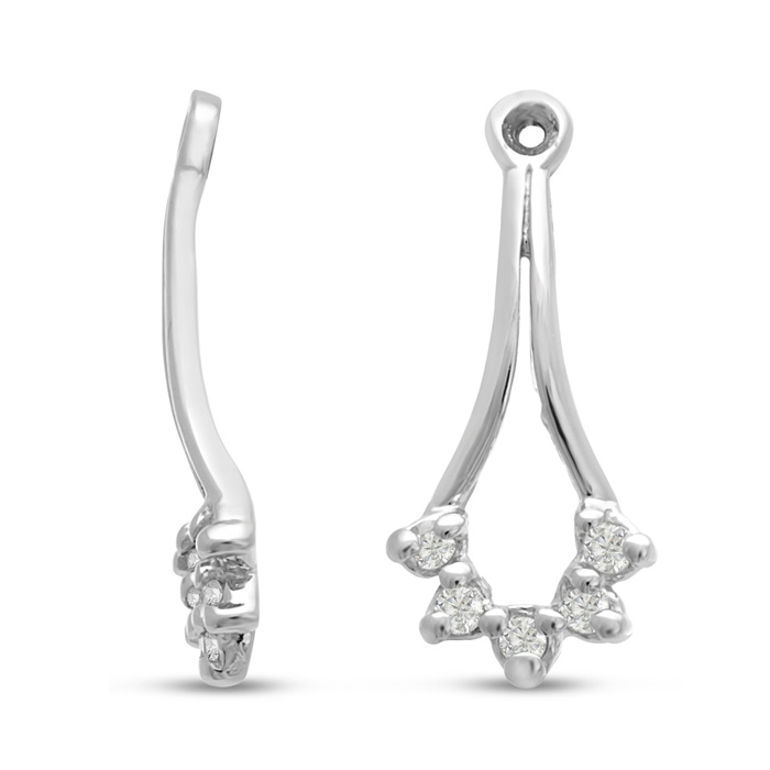 Beautiful 14K white gold cluster diamond earring jackets. These jackets can hold any size stud earring. Jackets contain 0.15ct of diamonds in G-H color, I1-I2 clarity. Jackets dangle about 3/4 inch down. Jackets contain 10 diamonds total.