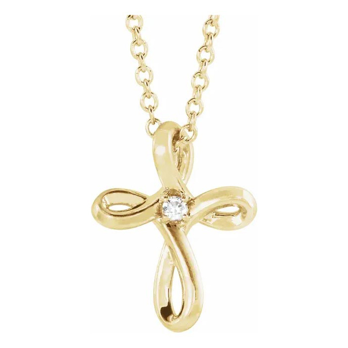 This classic cross necklace features 1 sparkling diamond in G-H color, I1 clarity. Total carat weight is 0.015 carats. This necklace is in 14 karat yellow gold and has a 16 inch cable chain with a two inch extender and a lobster-claw clasp.