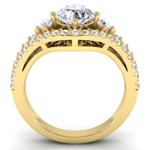 This gorgeous diamond engagement ring features a stunning 1.25 carat clarity enhanced center diamond - I-J color, I1-I2 clarity enhanced. It is surrounded by 42 sparkling diamonds all in I-J color, I1-I2 clarity. Ring is crafted in 14 karat yellow gold.