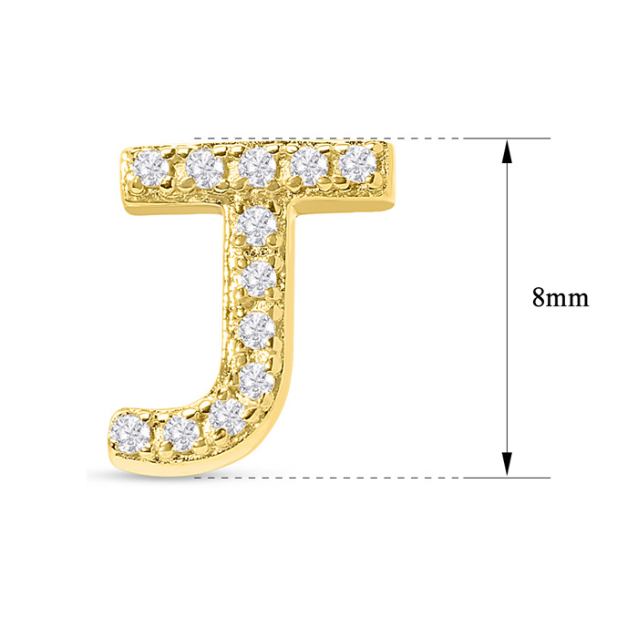 These diamond initial stud earrings feature 18-26 sparkling natural diamonds in H-I color, SI2-I1 clarity weighing 1/10 carat. All letters are available. Each earring measures approximately 1/4 inch. These earrings are available in sterling silver and 14k yellow gold over sterling silver and have comfortable and secure post with friction backs.