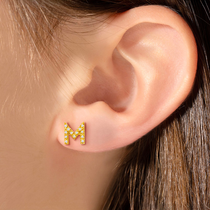 1/10 Carat Natural Diamond Letter M Initial Earrings In 14K Yellow Gold Over Sterling Silver