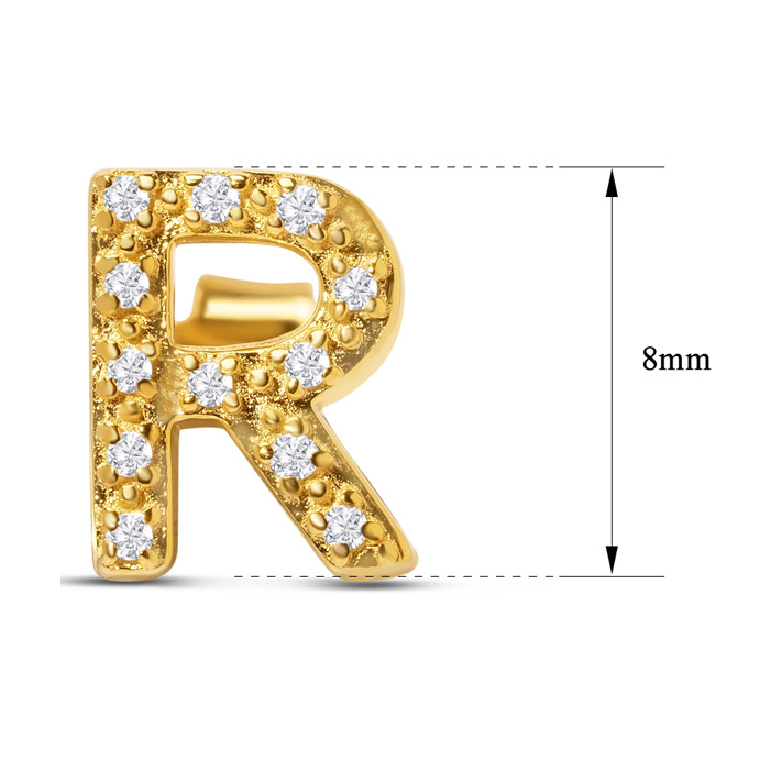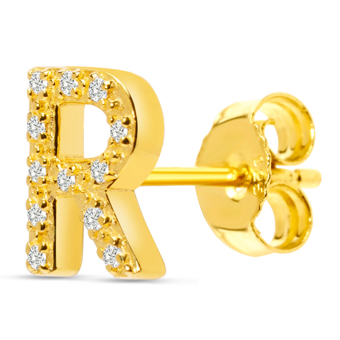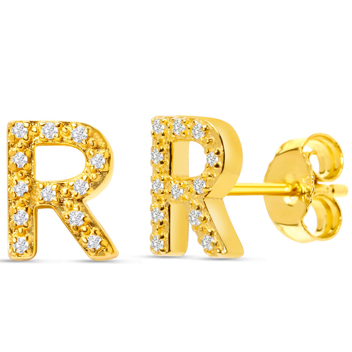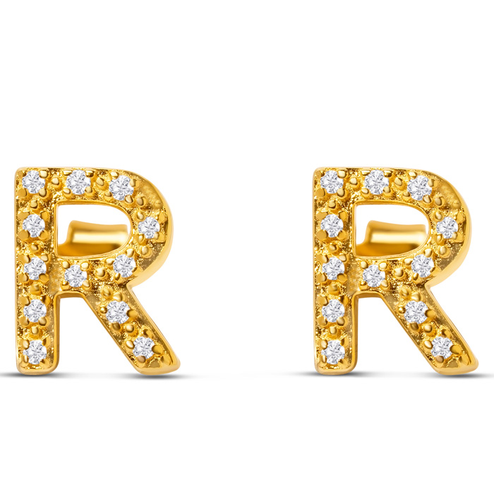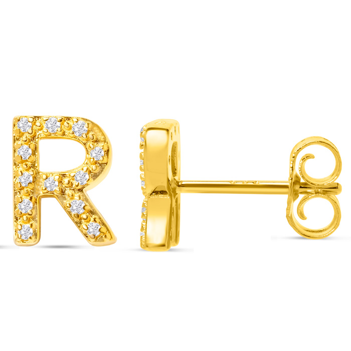 1/10 Carat Natural Diamond Letter R Initial Earrings In 14K Yellow Gold Over Sterling Silver