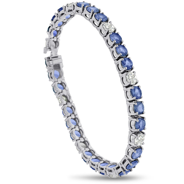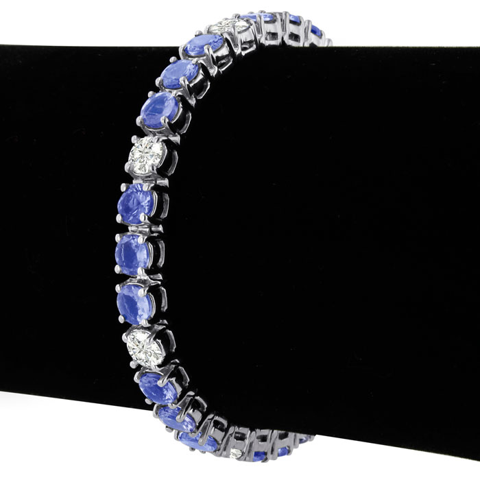Our largest and finest gemstone and diamond tennis bracelet. You won't find a finer diamond and tanzanite tennis bracelet anywhere, featuring 8 diamonds of over 1/2 carat each, and 24 tanzanites of 2/3 carats each. Total diamond weight of over 4 carats and total tanzanite weight of 12 carats, for a total of 16 carats total gem weight. The 14 karat white gold mounting is heavy and finely crafted. This is our finest bracelet.