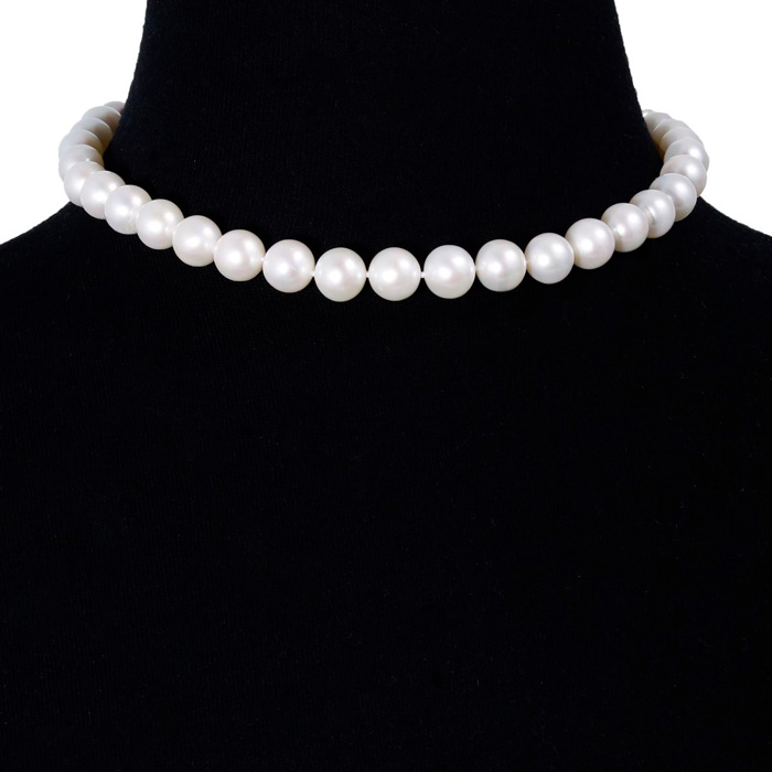 This classic hand-knotted 10mm pearl necklace is 16 inches long, with a 14 karat yellow gold fancy clasp. Necklace features AA+ quality cultured pearls.