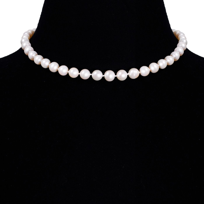 This classic hand-knotted 8mm pearl necklace is 16 inches long, with a 14 karat yellow gold fancy clasp. Necklace features AA+ quality cultured pearls.