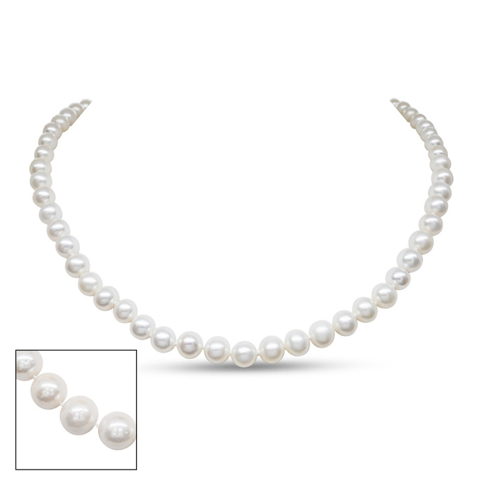 This classic hand-knotted 7mm pearl necklace is 18 inches long, with a 14 karat yellow gold fancy clasp. Necklace features AA+ quality cultured pearls.