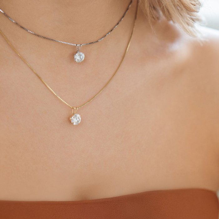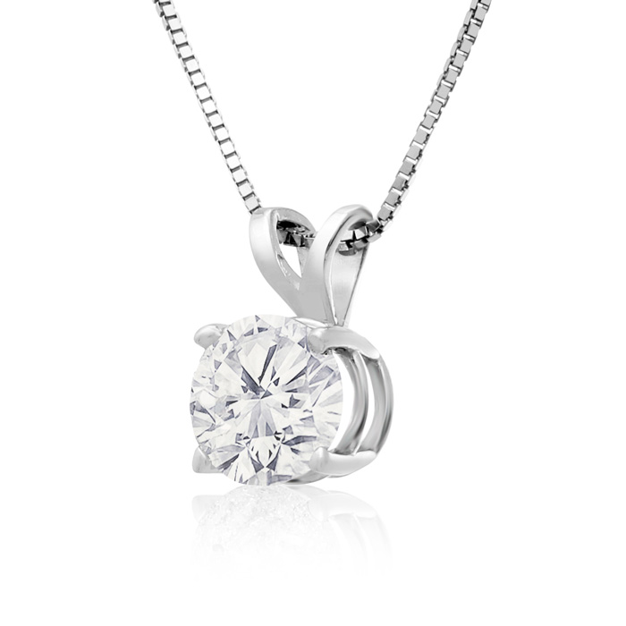 1ct White Gold Round Diamond Solitaire Pendant in SuperJeweler's Finest Solitaire Pendant Quality. Our 4 Stars diamonds are G/H Color, SI1/SI2 Clarity, which are top fine white color, extremely brilliant because of our fine cut and totally eye clean. The mounting is a heavy, sturdy 14k gold basket setting, to ensure safe long term wearability. It even comes with a complementary 18-inch chain.
