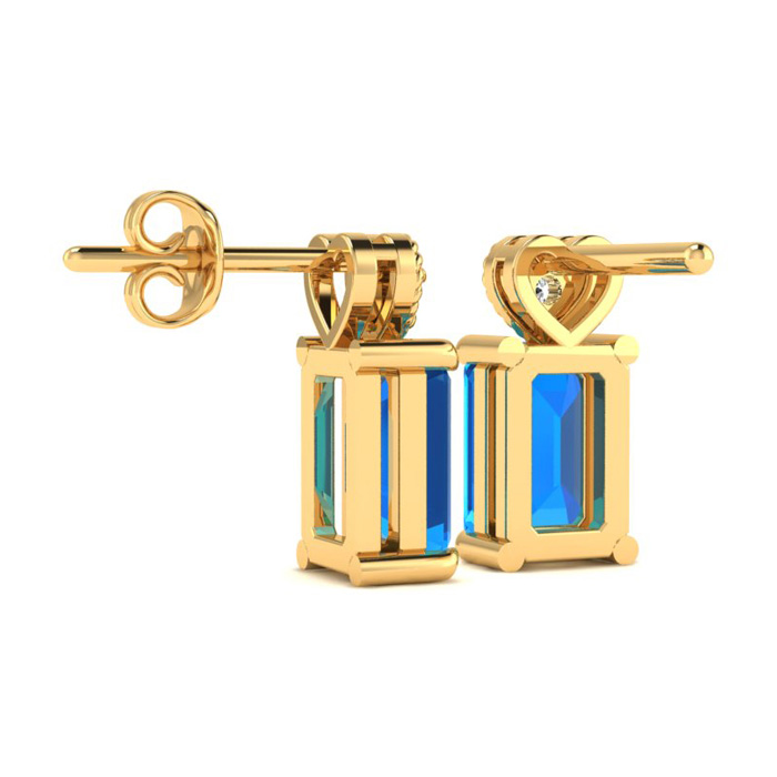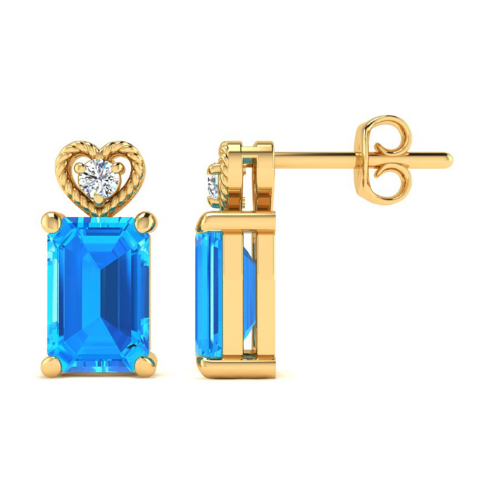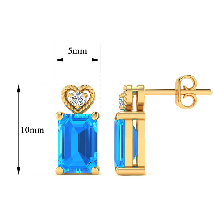 These earrings feature two 7x5mm emerald shape blue topaz gemstones at approximately 1 carat total weight. They are accented with two sparkling diamonds in I-J color, I1-I2 clarity. These earrings are in 10 karat yellow gold and have secure post with friction backs.