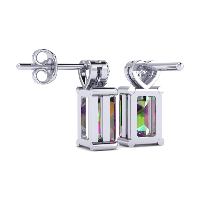 These earrings feature two 7x5mm emerald shape mystic topaz gemstones at approximately 1 carat total weight. They are accented with two sparkling diamonds in I-J color, I1-I2 clarity. These earrings are in 10 karat white gold and have secure post with friction backs.