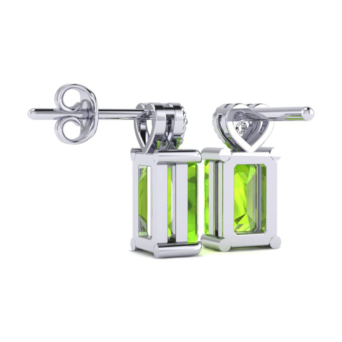 These earrings feature two 7x5mm emerald shape peridot gemstones at approximately 1 carat total weight. They are accented with two sparkling diamonds in I-J color, I1-I2 clarity. These earrings are in 10 karat white gold and have secure post with friction backs.