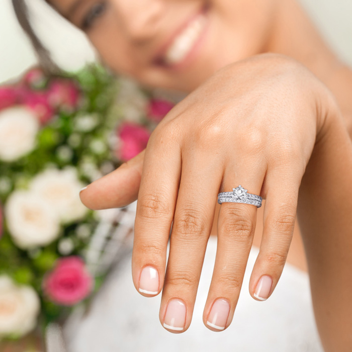 The ultimate classic diamond engagement ring and wedding band! This beautiful bridal set is 2 carats total diamond weight, including a full 1 carat center diamond. The color of the diamonds is I-J, and the clarity is I1-I2 and is Clarity Enhanced.