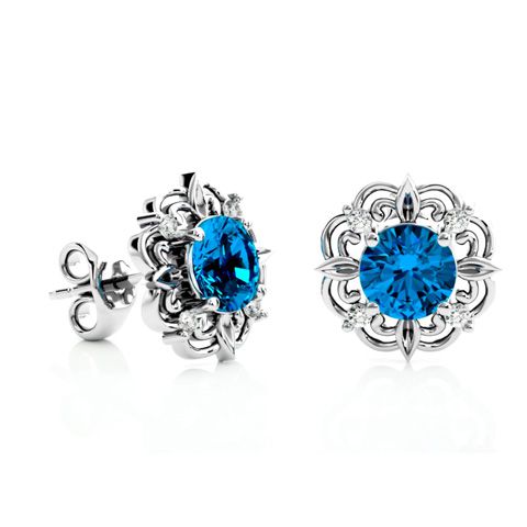 2 1/10 Carat Blue Topaz and Diamond Antique Stud Earrings In 14 Karat White Gold