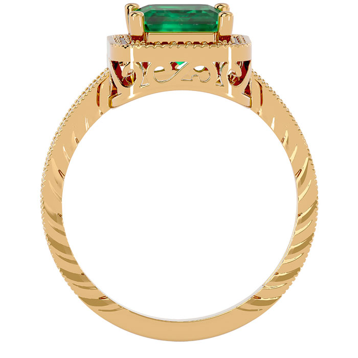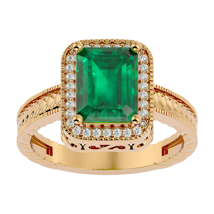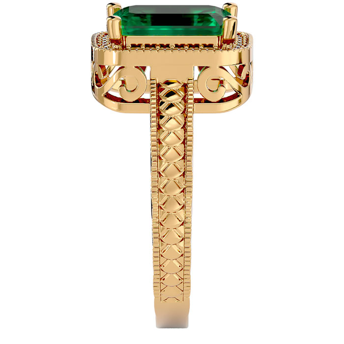 This antique style gemstone ring features an 9x7mm emerald cut emerald gemstone weighing approximately 2 1/4 carats. There are 30 side diamonds in I-J color, I1-I2 clarity totaling approximately 1/5 carat. Total carat weight is approximately 2 1/2 carats. This ring is in 14 karat yellow gold.