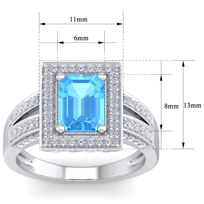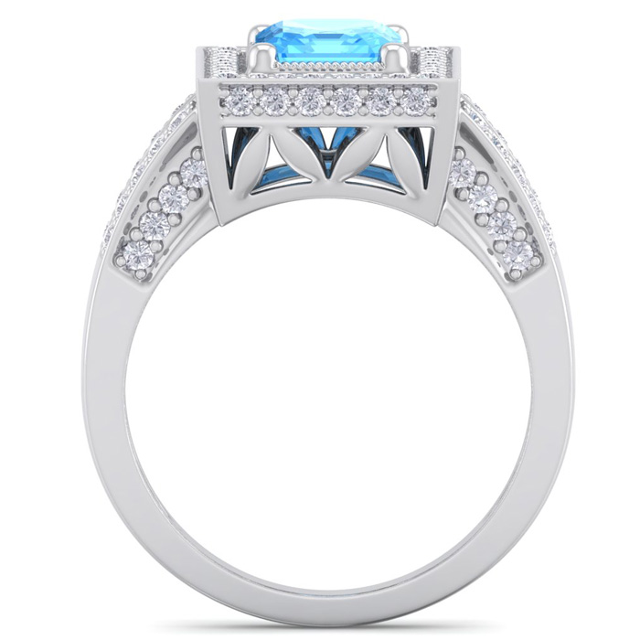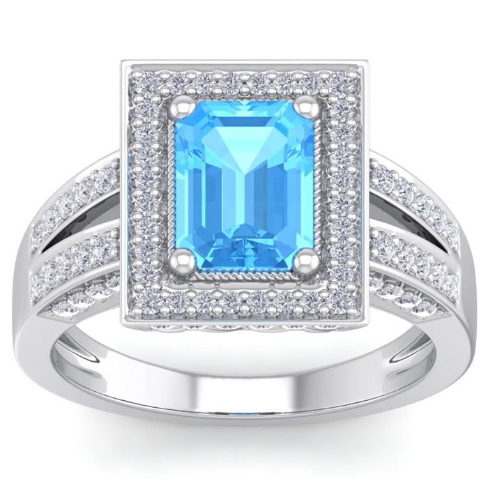 This elegant gemstone and diamond ring features one 8x6mm emerald cut blue topaz gemstone at approximately 1.90 carats. It is surrounded by 80 sparkling diamonds in I-J color, I1-I2 clarity at 2/3 carat total weight. Total gem weight is approximately 2 1/2 carats. This ring is in 14 karat white gold.