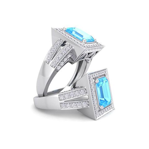This elegant gemstone and diamond ring features one 8x6mm emerald cut blue topaz gemstone at approximately 1.90 carats. It is surrounded by 80 sparkling diamonds in I-J color, I1-I2 clarity at 2/3 carat total weight. Total gem weight is approximately 2 1/2 carats. This ring is in 14 karat white gold.