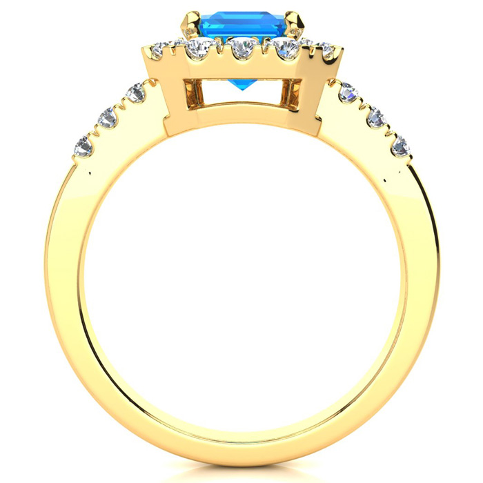 This stunning gemstone and diamond ring features one 8x6mm emerald cut blue topaz gemstone at 1.90 carats. It is surrounded by 24 sparkling diamonds in a halo and down the band in I-J color, I1-I2 clarity at 0.54 carats. Total gem weight is 2.44 carats. This ring is crafted in 14 karat yellow gold.