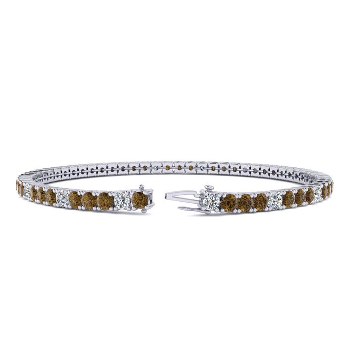 This classic gemstone bracelet features shimmering white diamonds in J-K color, I1-I2 clarity and chocolate bar brown champagne diamonds in I3 clarity. The 6 inch bracelet contains 57 chocolate bar brown champagne and white diamonds at 2.28 carats. The 6.5 inch bracelet contains 62 chocolate bar brown champagne and white diamonds at 2.48 carats. The 7 inch bracelet contains 67 chocolate bar brown champagne and white diamonds at 2.68 carats. The 7.5 inch bracelet contains 72 chocolate bar brown champagne and white diamonds at 2.88 carats. The 8 inch bracelet contains 76 chocolate bar brown champagne and white diamonds at 3.04 carats. The 8.5 inch bracelet contains 81 chocolate bar brown champagne and white diamonds at 3.24 carats. The 9 inch bracelet contains 86 chocolate bar brown champagne and white diamonds at 3.44 carats. This bracelet is approximately 2.25mm wide and is crafted in 14 karat white gold. This bracelet has a secure, box with tongue and safety clasp.