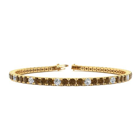 This classic gemstone bracelet features shimmering white diamonds in J-K color, I1-I2 clarity and chocolate bar brown champagne diamonds in I3 clarity. The 6 inch bracelet contains 57 chocolate bar brown champagne and white diamonds at 2.28 carats. The 6.5 inch bracelet contains 62 chocolate bar brown champagne and white diamonds at 2.48 carats. The 7 inch bracelet contains 67 chocolate bar brown champagne and white diamonds at 2.68 carats. The 7.5 inch bracelet contains 72 chocolate bar brown champagne and white diamonds at 2.88 carats. The 8 inch bracelet contains 76 chocolate bar brown champagne and white diamonds at 3.04 carats. The 8.5 inch bracelet contains 81 chocolate bar brown champagne and white diamonds at 3.24 carats. The 9 inch bracelet contains 86 chocolate bar brown champagne and white diamonds at 3.44 carats. This bracelet is approximately 2.25mm wide and is crafted in 14 karat yellow gold. This bracelet has a secure, box with tongue and safety clasp.