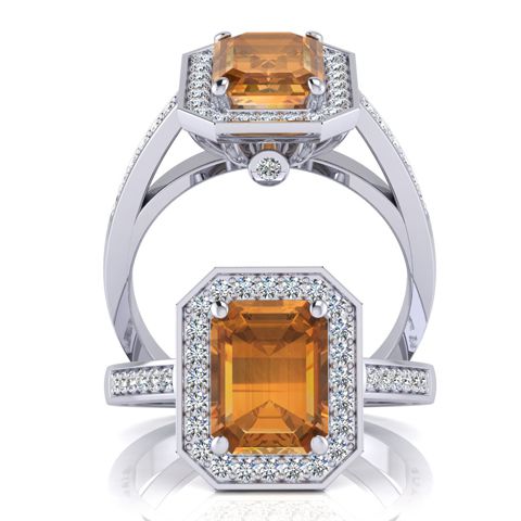 This stunning gemstone and halo diamond ring features one 9x7mm emerald shape citrine gemstone at 2 carats. It is surrounded by 42 sparkling diamonds in a halo and down the band in I-J color, SI2-I1 clarity at 0.43 carats. Total gem weight is 2.43 carats. This ring is crafted in 14 karat white gold.