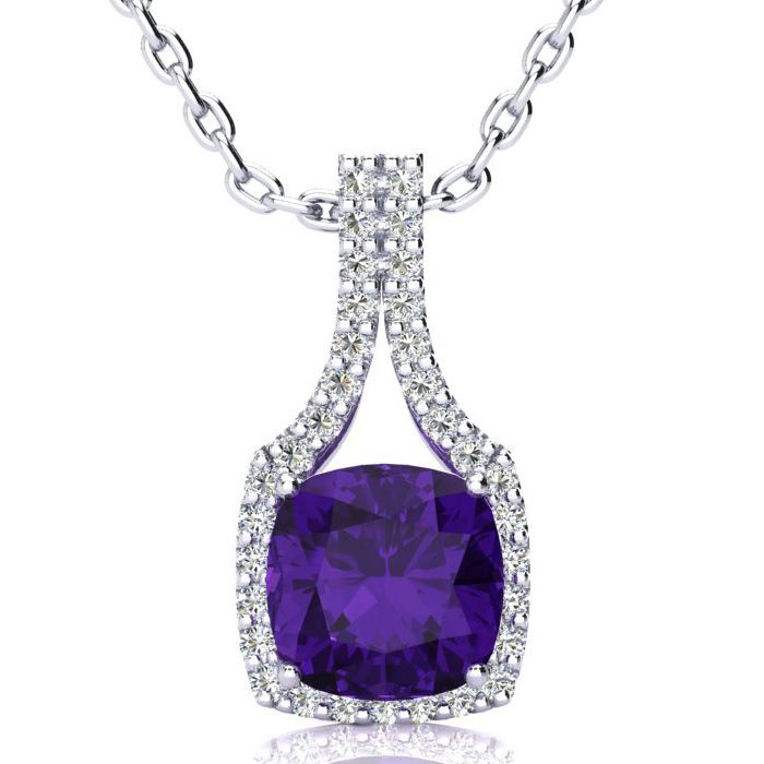 This stunning gemstone and halo diamond necklace features one 8x8mm cushion cut amethyst gemstone at 2.10 carats. It is surrounded by 33 sparkling diamonds in a halo in I-J color, SI2-I1 clarity at 0.41 carats. Total gem weight is 2.51 carats. This necklace is crafted in 14 karat white gold and comes with an 18 inch cable chain with spring-ring clasp.