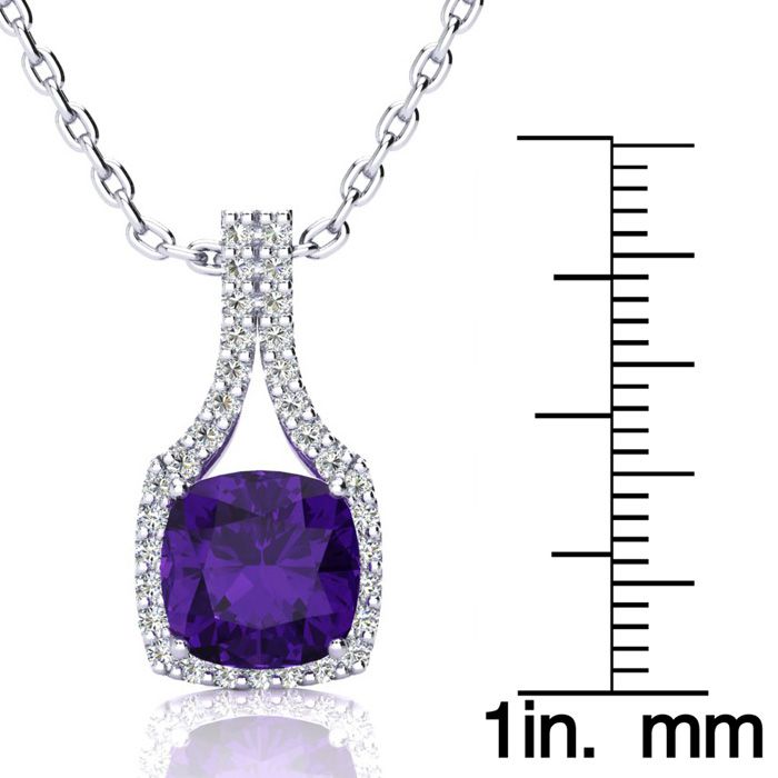 2 1/2 Carat Cushion Cut Amethyst and Classic Halo Diamond Necklace In 14 Karat White Gold, 18 Inches