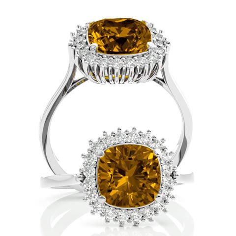 2 1/2 Carat Cushion Cut Citrine and Halo Diamond Ring In 14K White Gold