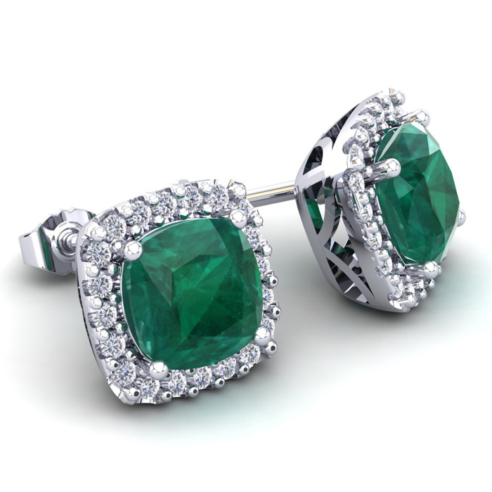 2 1/2 Carat Cushion Cut Emerald and Halo Diamond Stud Earrings In 14 Karat White Gold