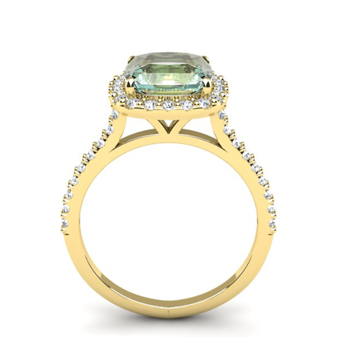 2 1/2 Carat Cushion Cut Green Amethyst and Halo Diamond Ring In 14K Yellow Gold