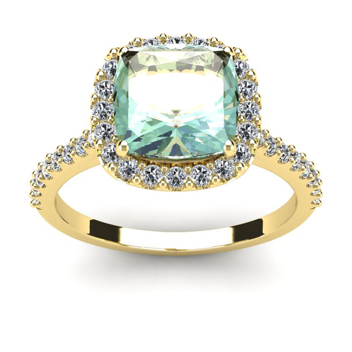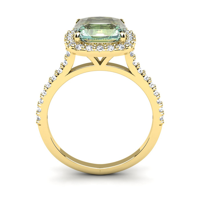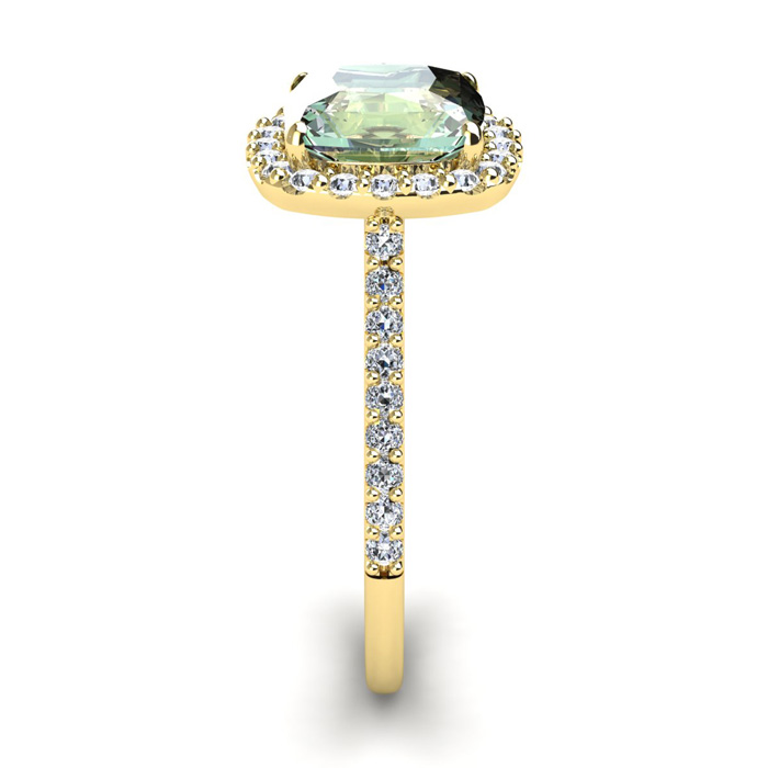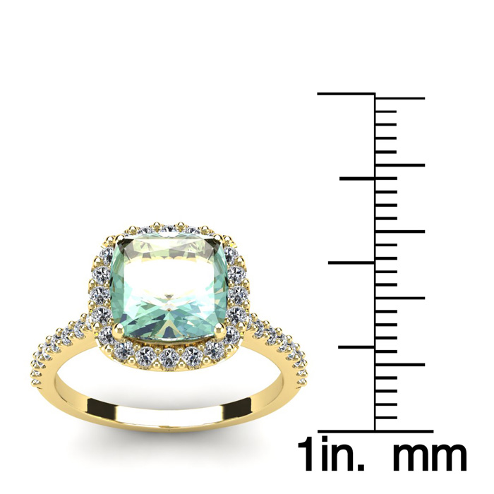 2 1/2 Carat Cushion Cut Green Amethyst and Halo Diamond Ring In 14K Yellow Gold