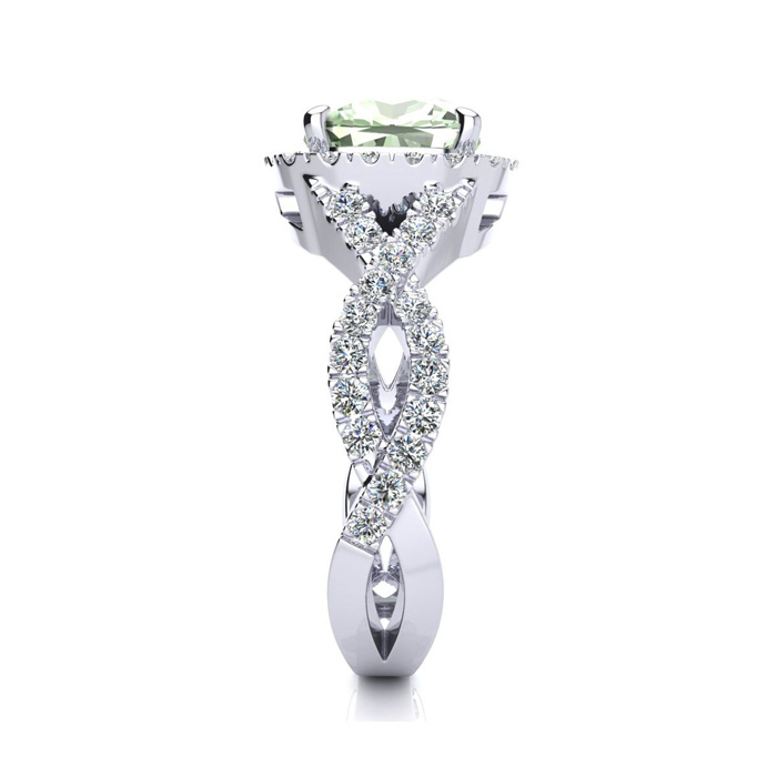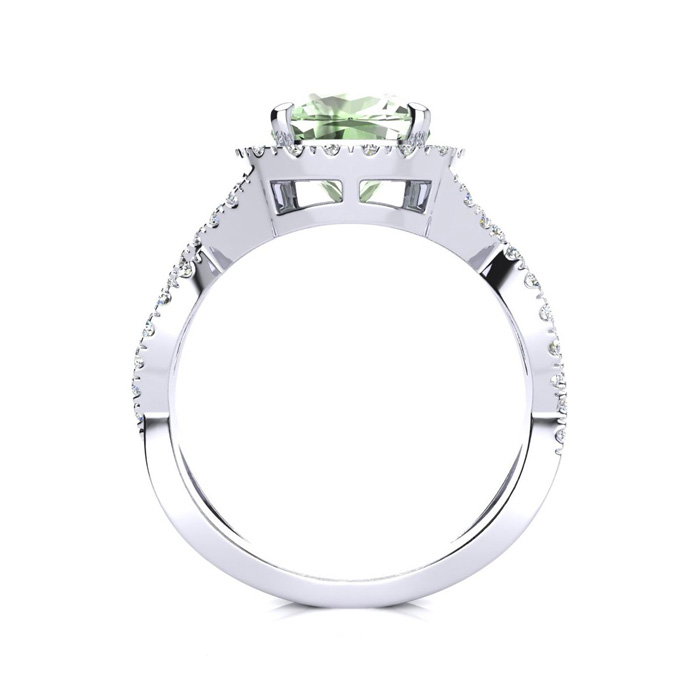 2 1/2 Carat Cushion Cut Green Amethyst and Halo Diamond Ring With Fancy Band In 14 Karat White Gold