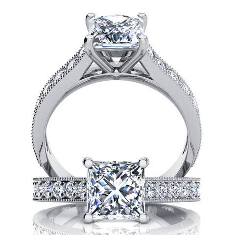 Beautiful traditional and timeless diamond engagement ring that will make any bride happy. With 2.50 carats of fiery diamonds, this engagement ring includes a 2.00 carat clarity enhanced Princess cut center diamond and 16 shimmering diamonds set in milgrain channels on the band. White I-J color diamonds of I1-I2 clarity and mounted in 14k white
