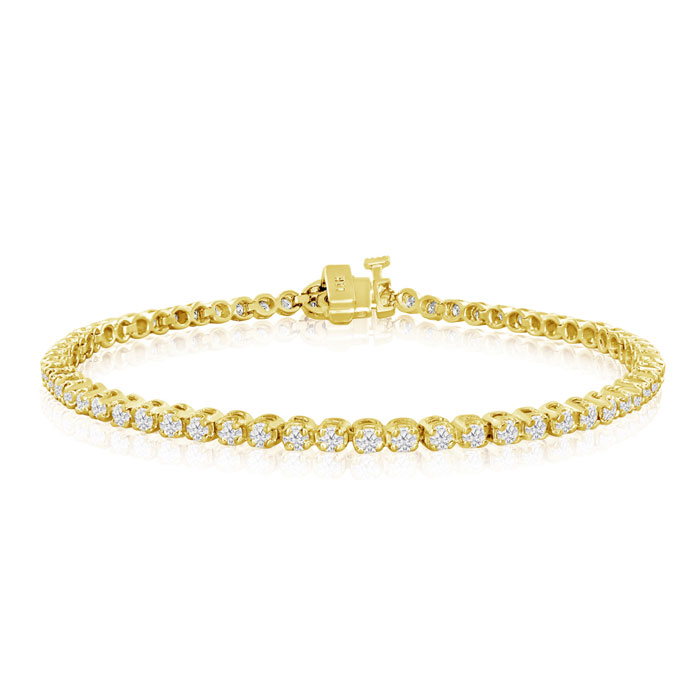 Beautiful new classic diamond mens tennis bracelet containing 2 1/2 carats of bright whitish diamonds, crafted in 14 karat Yellow gold. SuperJeweler's diamond mens tennis bracelets are made with the finest mountings, made to last a lifetime, completed with shimmering, bright diamonds. Diamond color is I/J, diamond clarity is I1/I2.