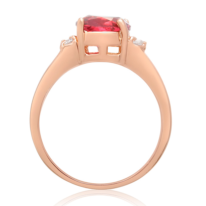 This ring has the look of a 2 1/2 carat ruby and diamond ring. The center of the ring is a stunning 9x7mm oval shape crystal ruby. It is surrounded by sparkling created diamonds. Ring is crafted in 18 karat rose gold over brass.